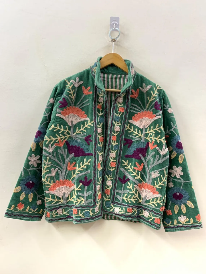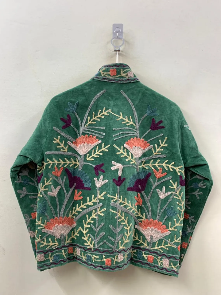 Handmade Velvet Vintage Suzani Floral Pattern Winter Short Jacket Breathable Boho Bomber Coat Winter Warmed Knitted Jacket