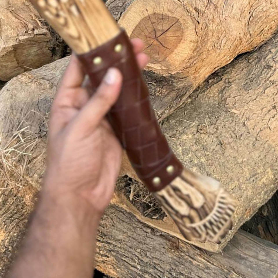 Handmade Industrial Grade Viking Axe Engraved Nordic Head Carbon Steel Blade Wooden Leather Wrap Inspired Scandinavian Heritage