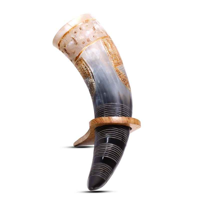 Handmade Viking Drinking Horn with Wood Stand: Engraved Norse Beer Mug