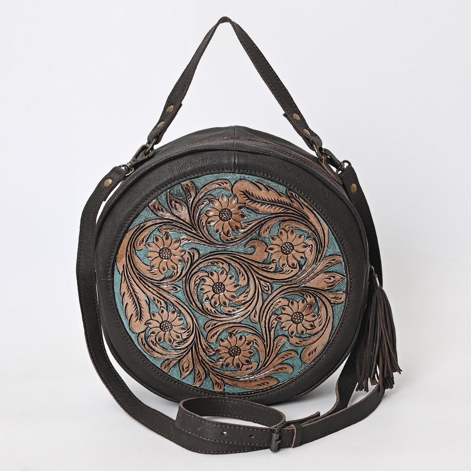 Handmade Vintage Antique Flower Design Leather Tote Bag for Ladies Multiple Pocket Crossbody Shoulder Strap Zip Fashion Style