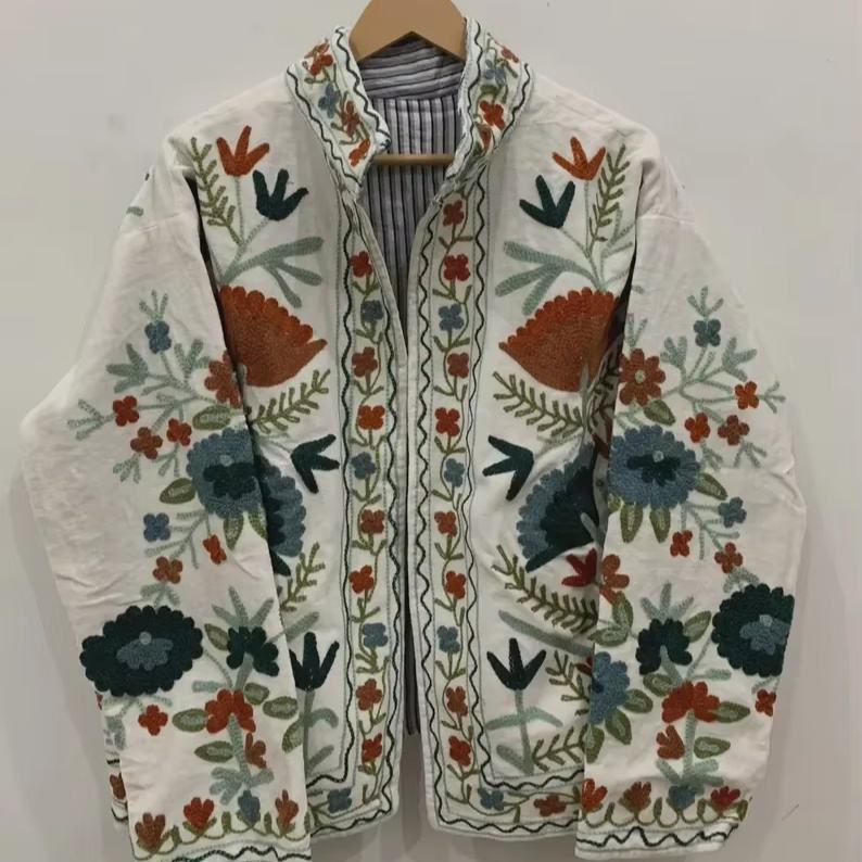 Handmade Vintage Boho Unisex Winter Jacket Floral Embroidered Suzani with Cotton Filling Ethnic Chic Outerwear Cozy Velvet Coat