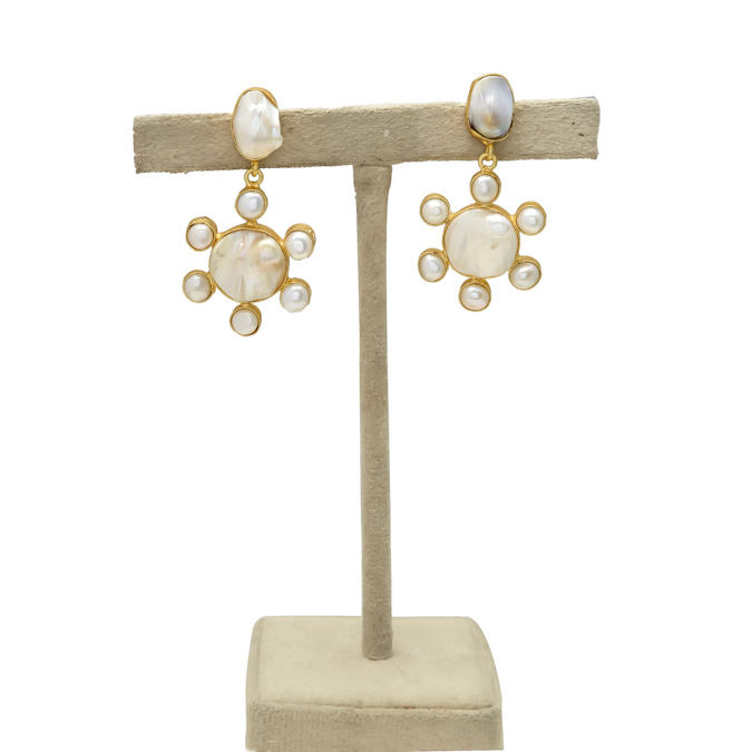 Handmade Vintage Christian Wedding Bridal Brass Hanging Round Shape Stud Statement Earring 24K Gold Plated Nickel Free Pearl