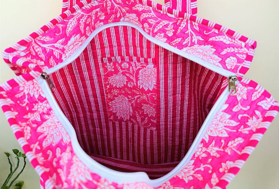 Handmade Vintage Cotton Women's Tote Bag Indian Handblock Printed Floral Quilted Zipper Shoulder Beach Bag Spring Summer Winter