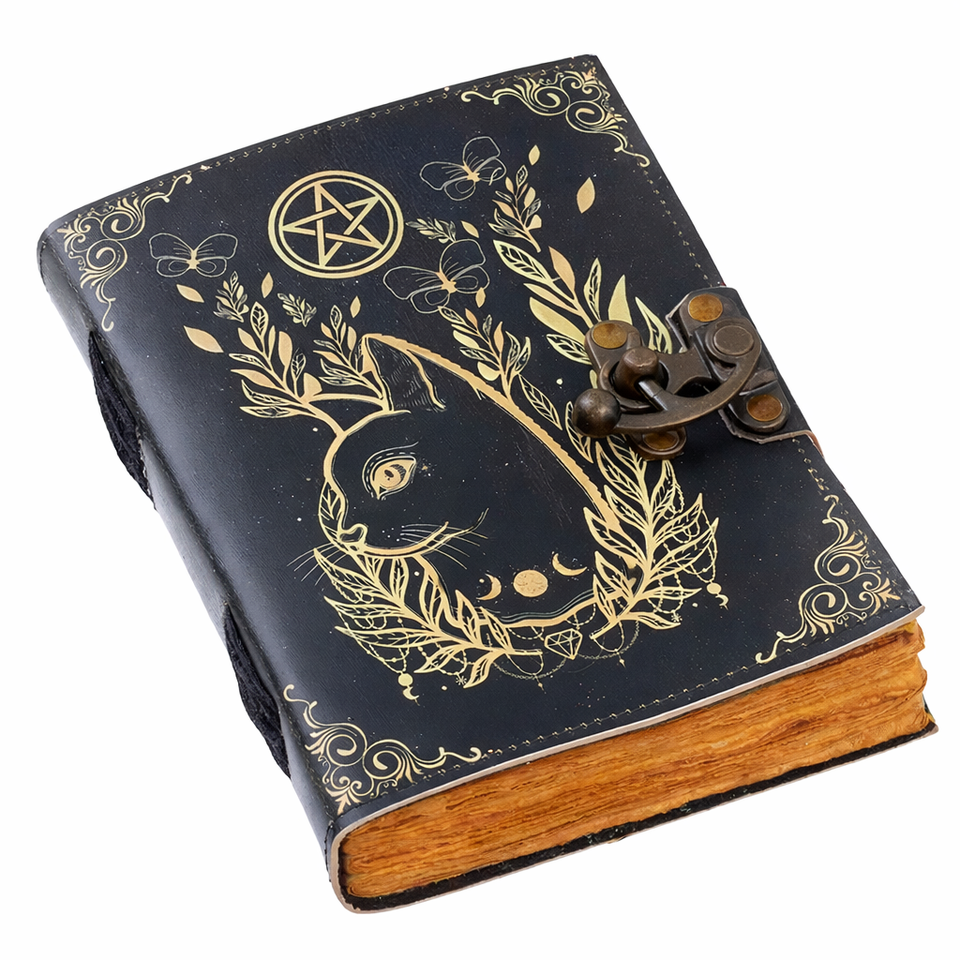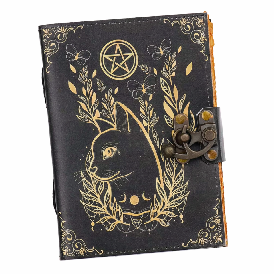 Handmade Vintage Deckle Edge Grimoire - Wiccan 'Little Witch Cat' Print Journal & Book of Shadows for Witchcraft