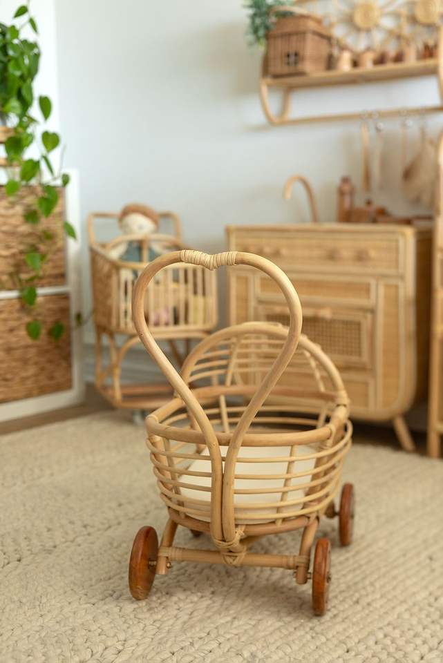 Handmade Vintage Inspired Rattan Doll Stroller with Heart Handle Kids' Toy Pram for Nursery Decor
