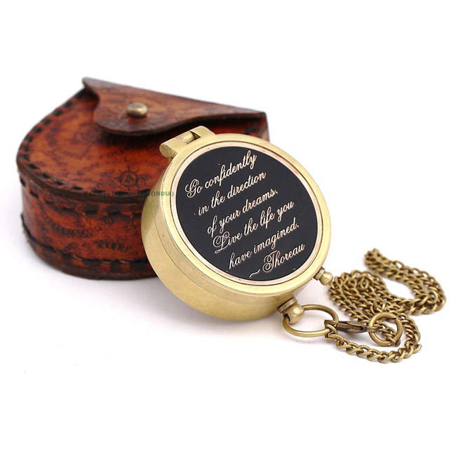 Handmade Vintage Nautical Brass Compass Leather Case Lightweight Pointer Dial Personalized Engraved Quote for Camping Hiking