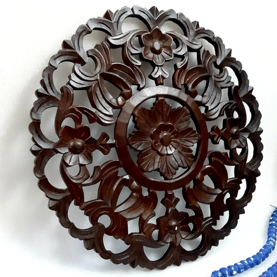 Handmade Wall Art Living Room Decor Vintage Botanical Carved Wooden Round Panel Home Accent Walnut Finish Wall Decor