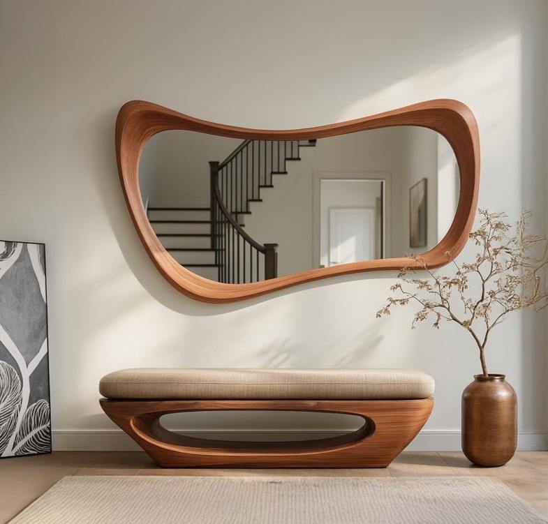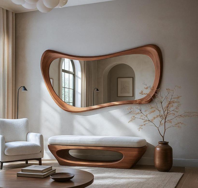 Handmade Walnut Wood Art Deco Asymmetrical Wavy Lightweight Eco Friendly Wall Mirror Home Decor Cheap Price