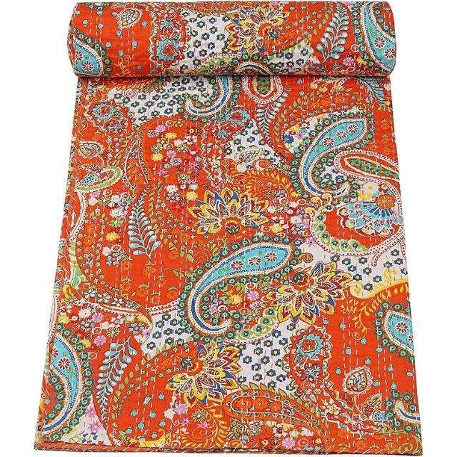 Handmade Washable Orange Cotton Kantha Quilt Traditional Indian Bohemian Vintage Reversible Bedspread for Home & Hotels