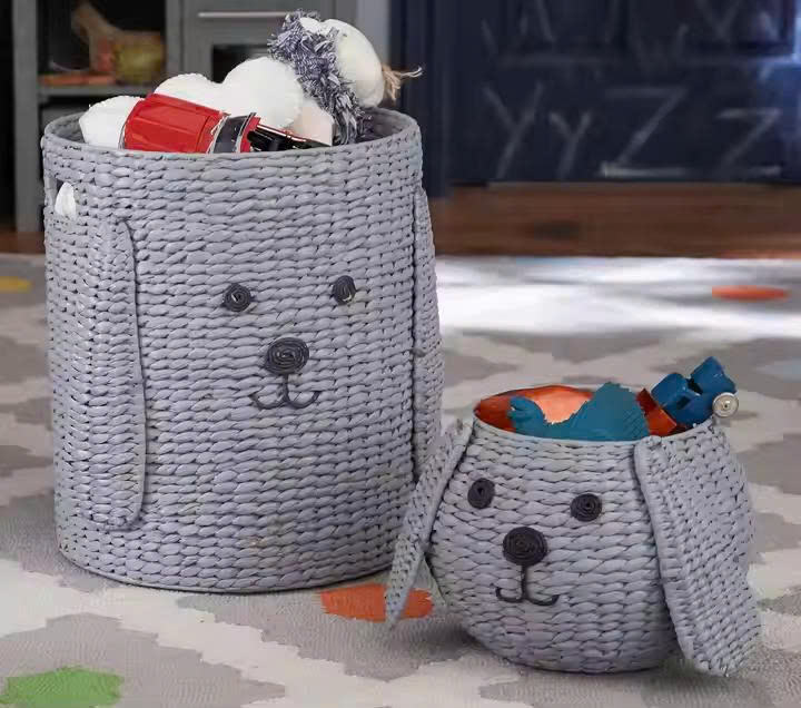 Handmade Water Hyacinth Storage Basket Puppy Hamper for Kids Toy Organization Cute Laundry Hamper for Kids Room and Decor