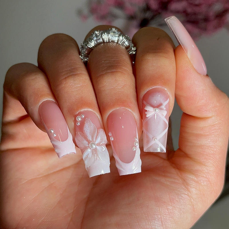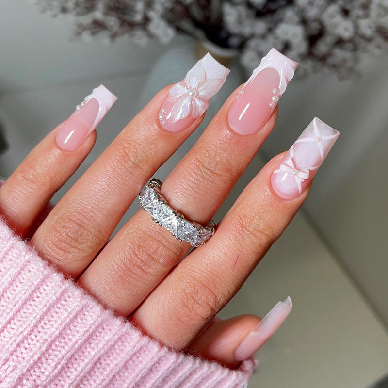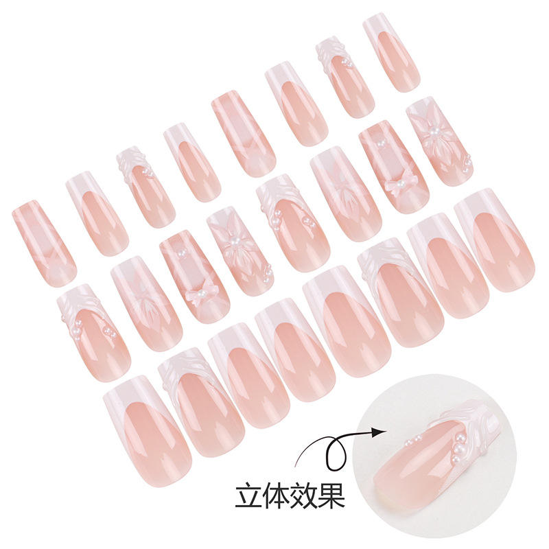 Handmade Wearable Chinese Square Tube Nail Tips Cross-Border Hot-Selling 3D Pearl Bowknot Flower Exquisite Fake Nails