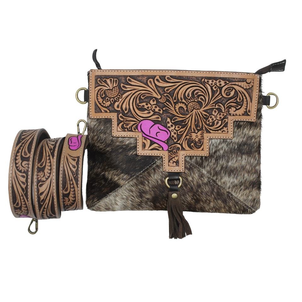 Handmade Western Style Cowhide Casual Tote Sling Bag Fashion Zipper Closure Chains Two Floral Flap Tooling Detachable Straps