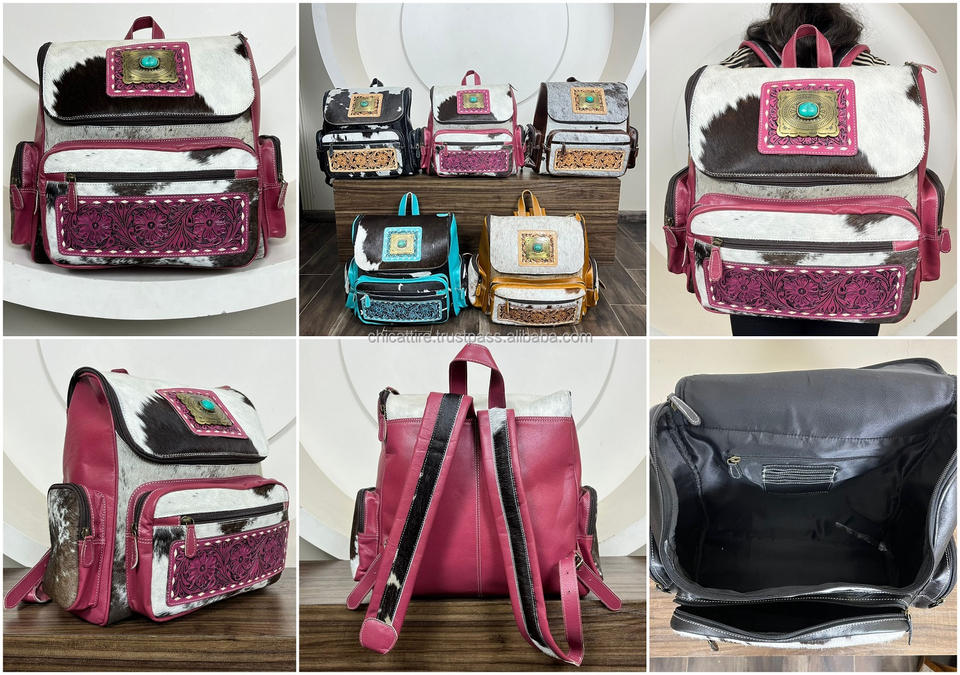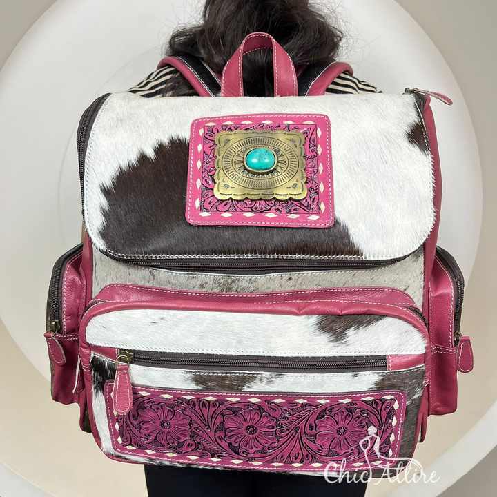 Handmade Western Tooled & Cowhide Leather New Floral designer Backpack with turquoise stone Stylish Ruck sag For Men & Women's