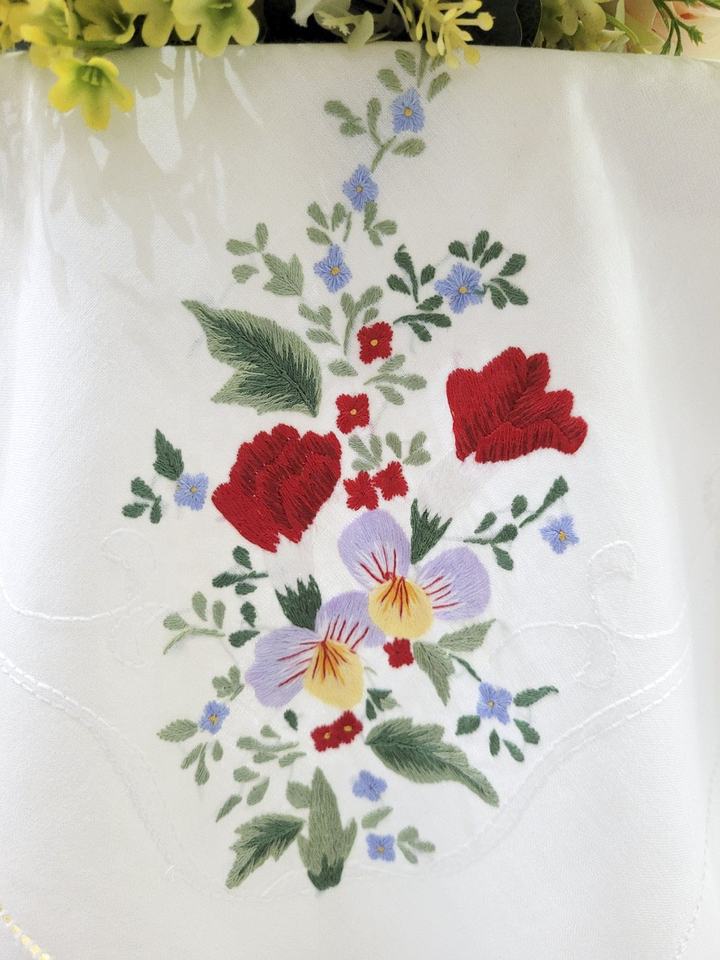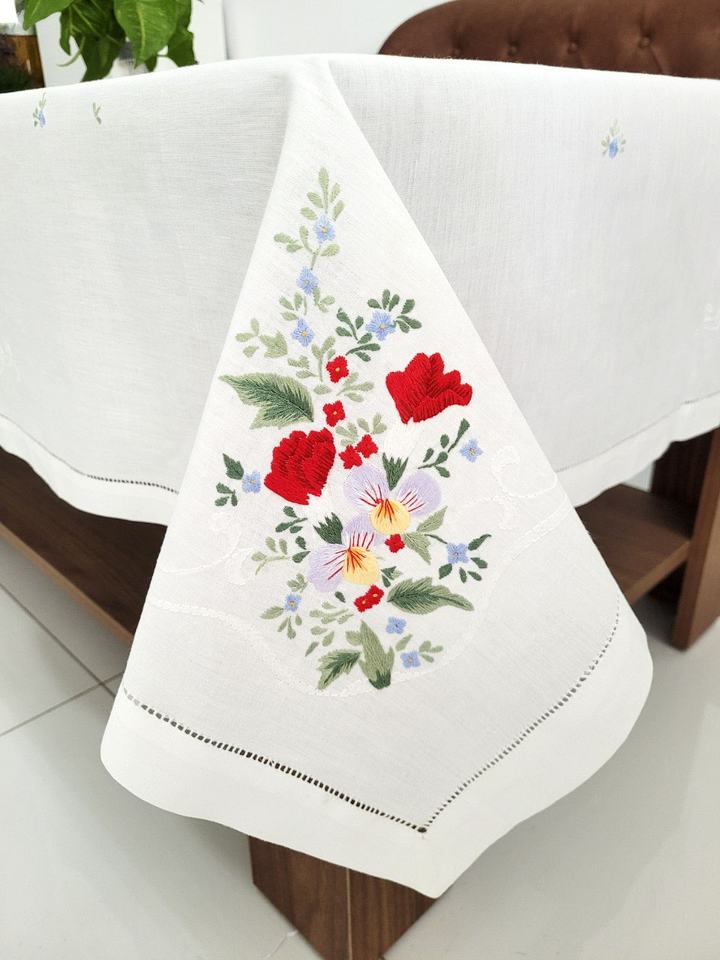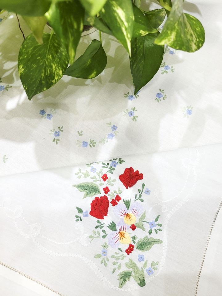 Handmade White Cotton Hemstitch Square Tablecloth with Embroidered Colorful Flowers Washable Home/Hotel/Restaurant Use Wholesale