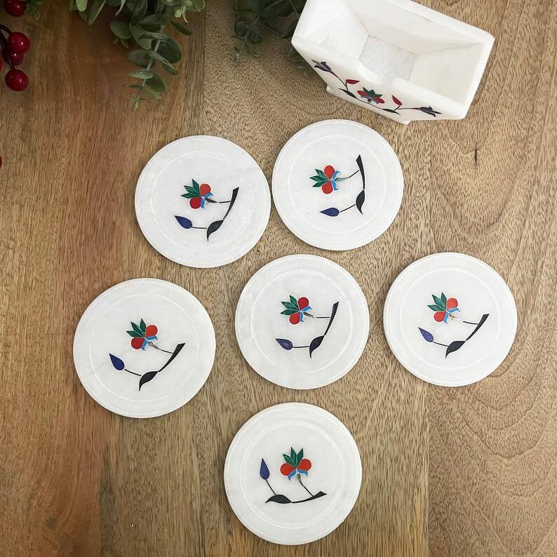 Handmade White Marble Coasters with Metal Inlay Square 4x4 Inch Set of 6 with Holder Decorative Table Coaster Set