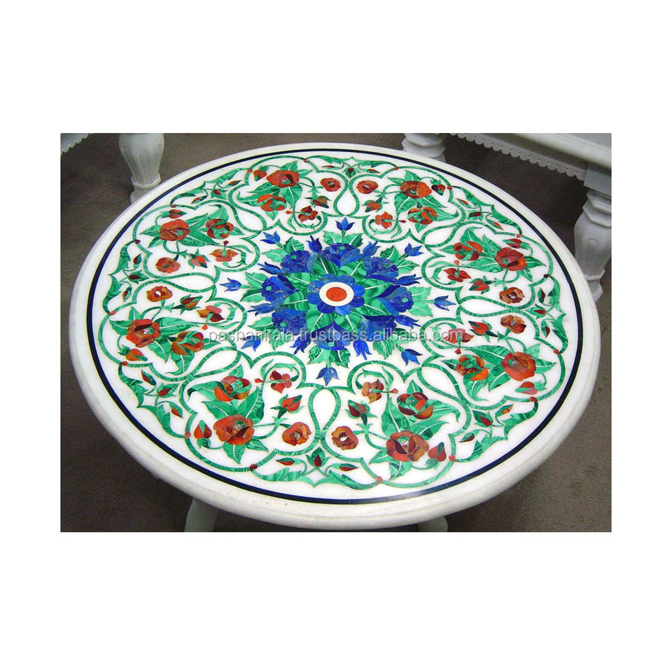 Marble inlay Table Top:Handmade White Marble Stone Inlay Amazing Design Round Table Top