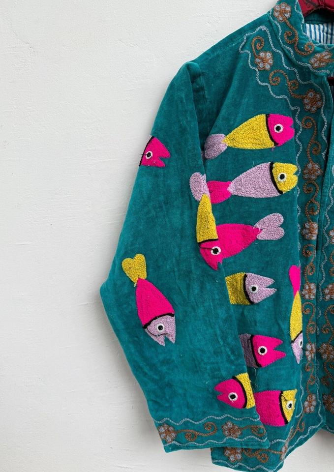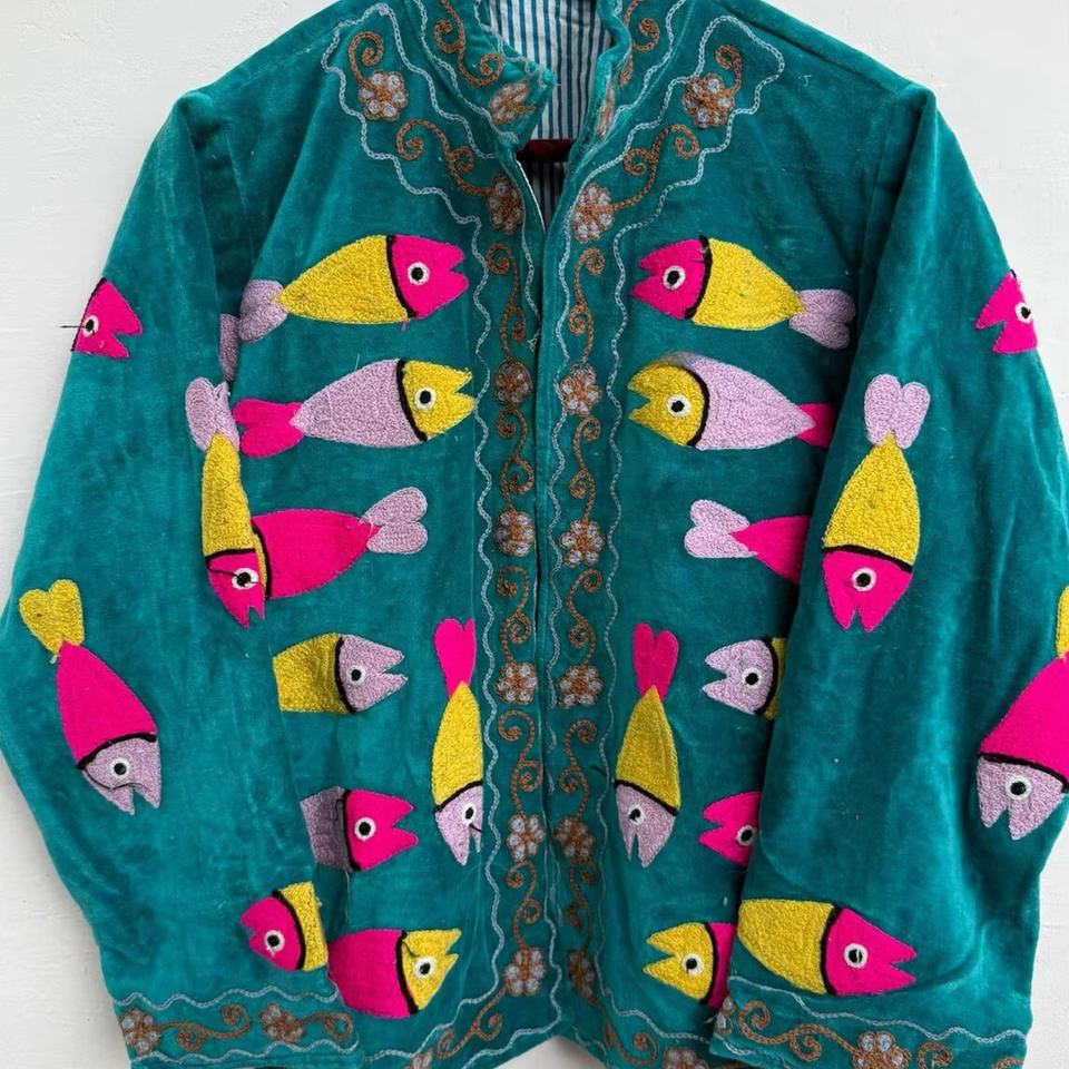 Handmade Winter Jacket Fish Printed Suzani Embroidery Quilted Coat in Indian Boho Style Handcrafted Velvet Cover Cotton Filling