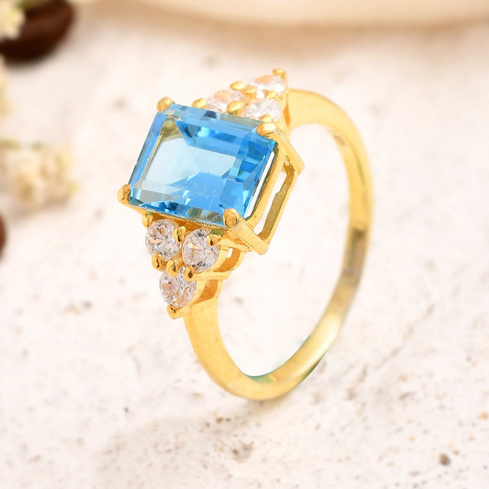 Handmade Women's Eternity Ring Solid 925 Sterling for Blue Topaz Hydro 7x9mm Emerald Cut Prong Set 14K Gold Plated Ring