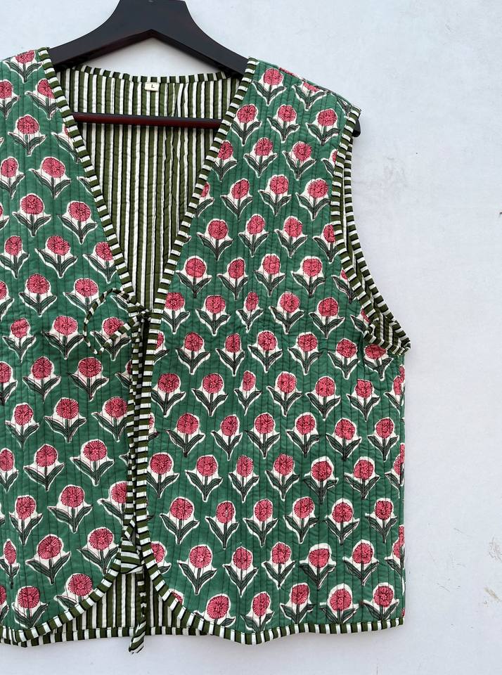 Handmade Women's Floral Printed Cotton Puffer Quilted Jacket V-Neck Front Open Tie-Sleeveless Short Category Women's Vests