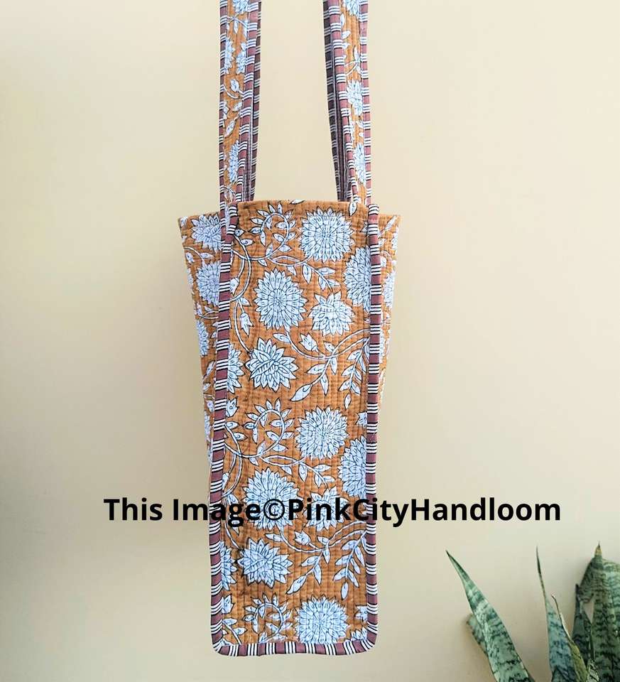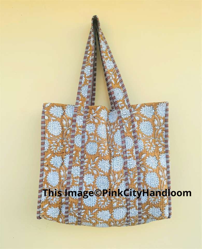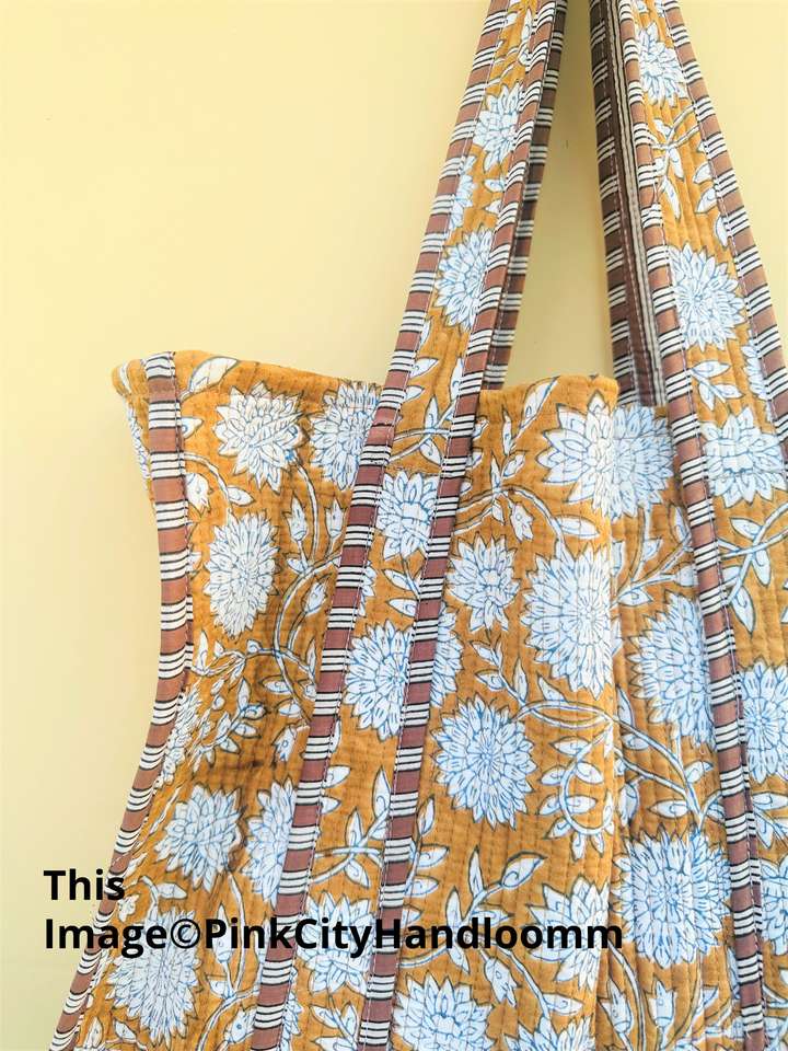 Handmade Women's Quilted Grocery Bag Hand Block Printed Indian Cotton Zipper Closure for Summer/Winter and Spring