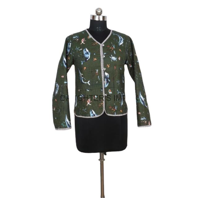Handmade Women's Short Reversible Kantha Quilted Jacket Breathable Boho Autumn Vintage Indian Fish Print Front Open Design