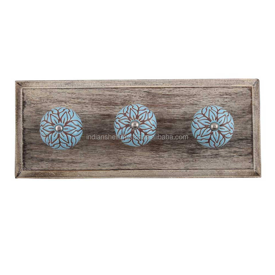 Handmade Wood Ceramic Floral Turquoise and Brown Towel Hooks Hangers Reusable Utility Hat Bags Mounted Clothes Heavy Duty