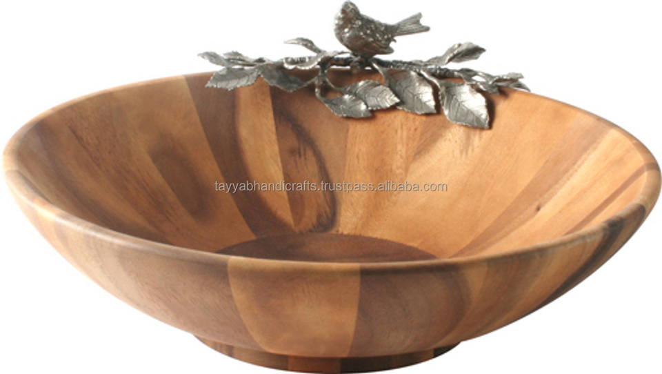 Handmade Wooden Acacia Wood Bowl with Metal Handle for Fruits Salad Soup for Home Hotel Restaurant Use Direct From India