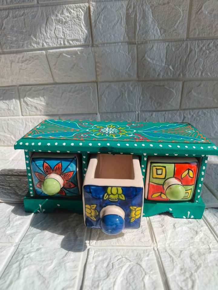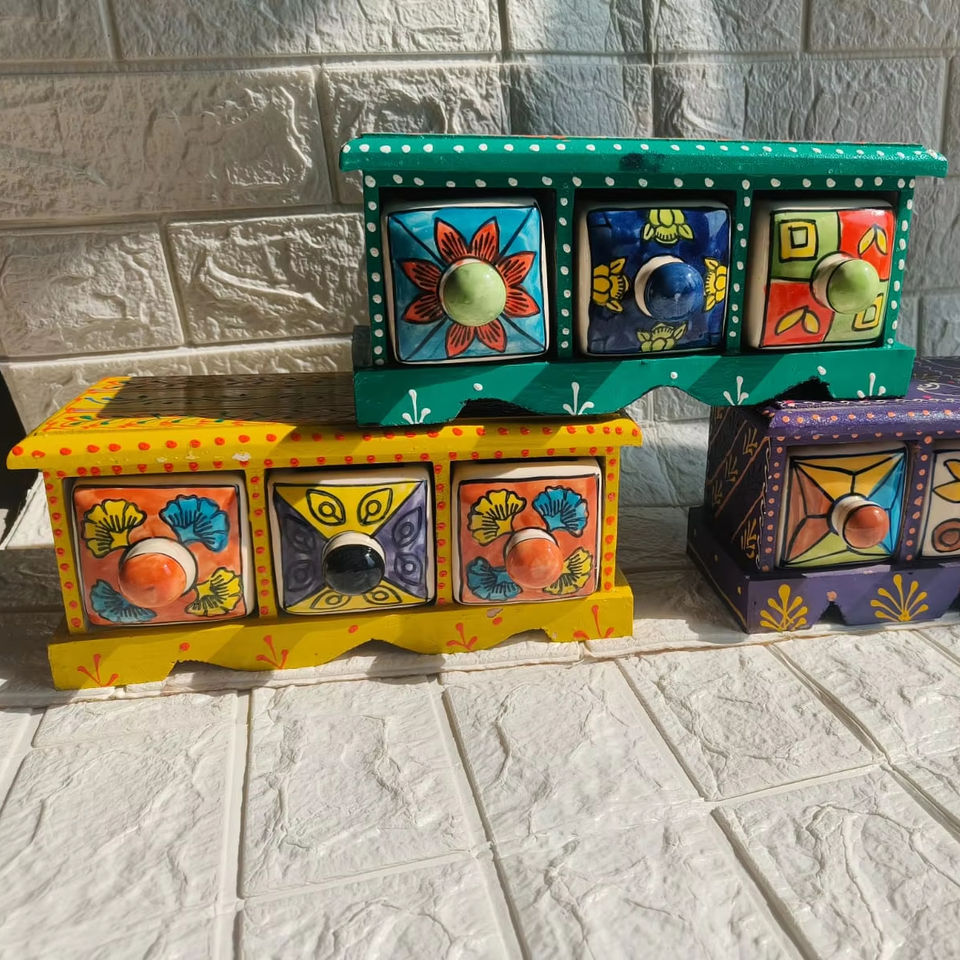 Handmade Wooden Ceramic 3 Compartment Spice Container Art Printed Kitchen Organizer with Ceramic Drawers Stylish Home Decor Gift