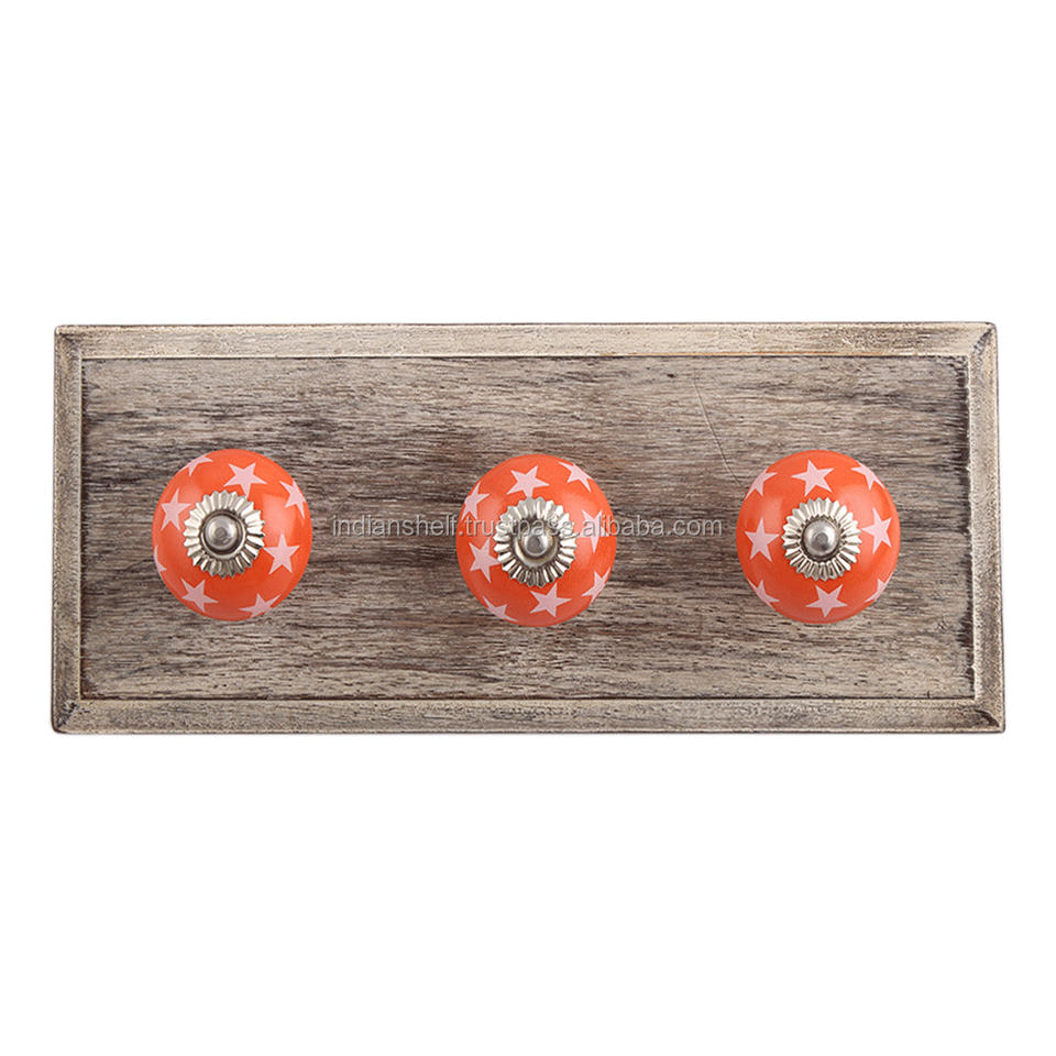 Handmade Wooden Ceramic Star Design White and Orange Wall Hooks Hangers Reusable Utility Mounted Hat Bags Clothes Heavy Duty