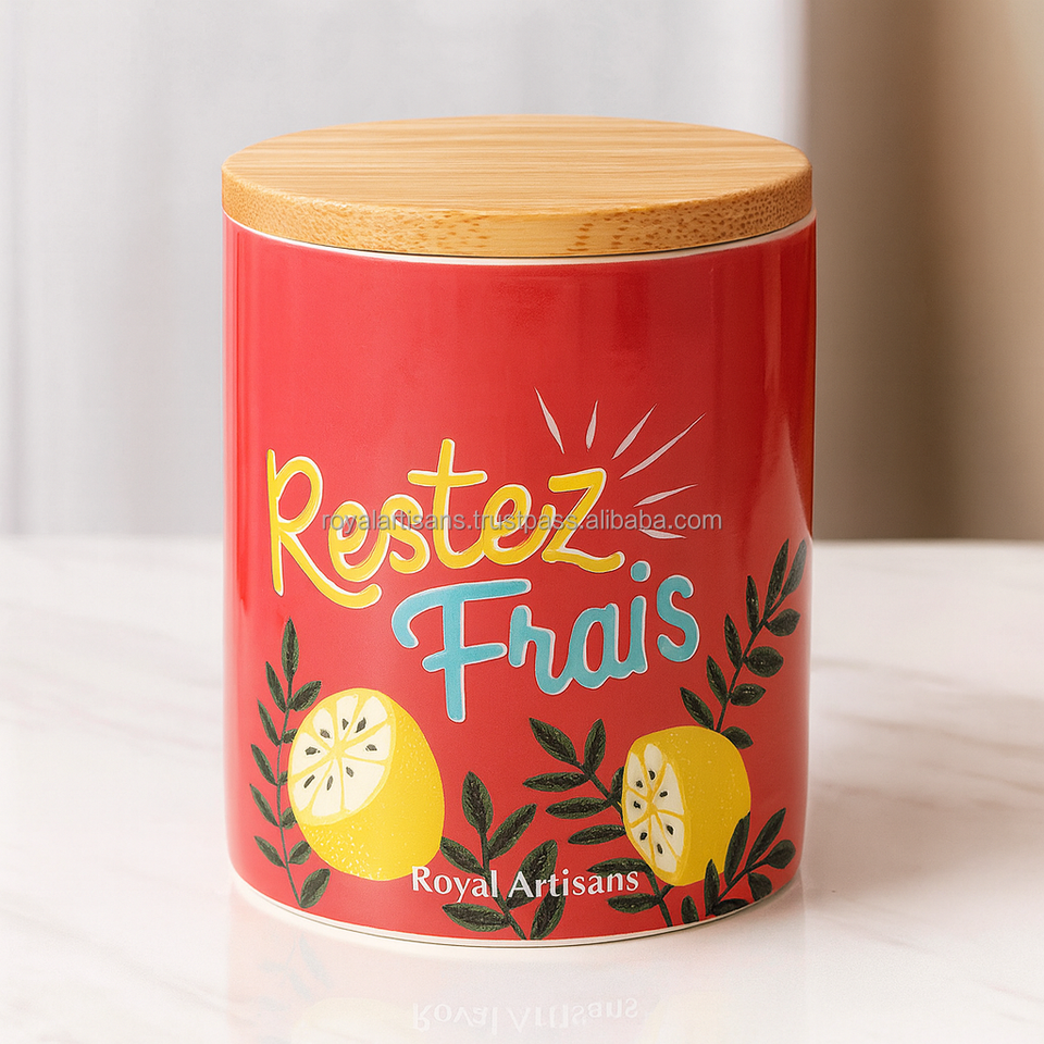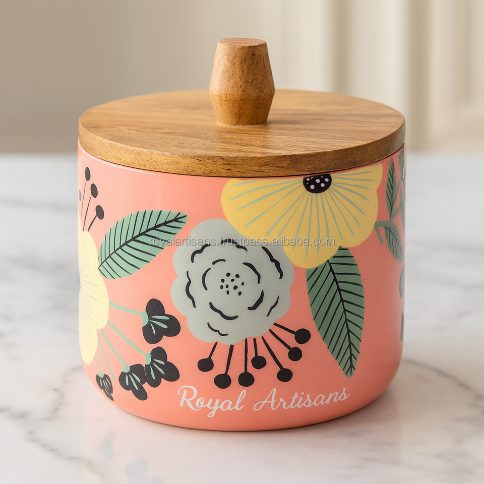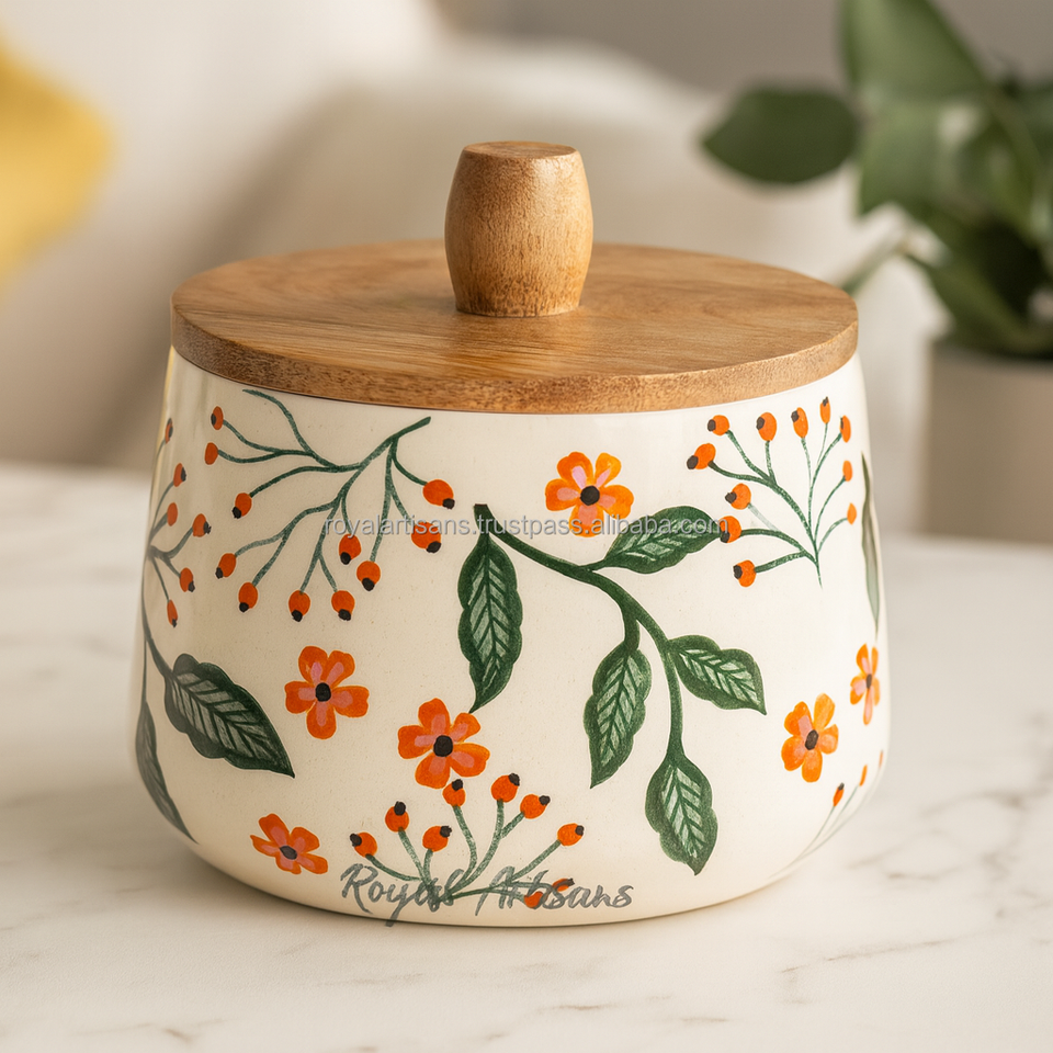 Handmade Wooden Enamel Storage Jar Flip Top Lid Floral Painted Kitchen Canister Sugar Tea Spices-American Style Giveaways