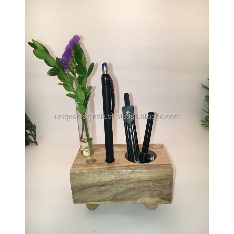 Handmade Wooden Pen Stand with Glass Vase Elegant Desk Organizer for Office Workspace and Gifting