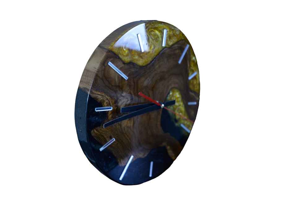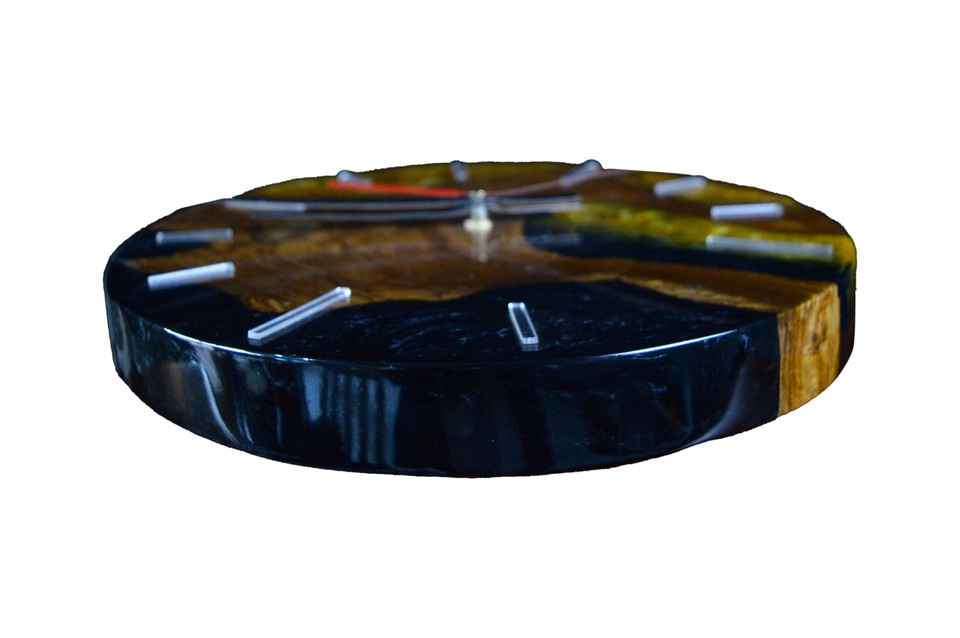 Handmade Wooden Resin Wall Clock - Natural Teak Wood with Black and Gold Epoxy Design, Modern Home Decor