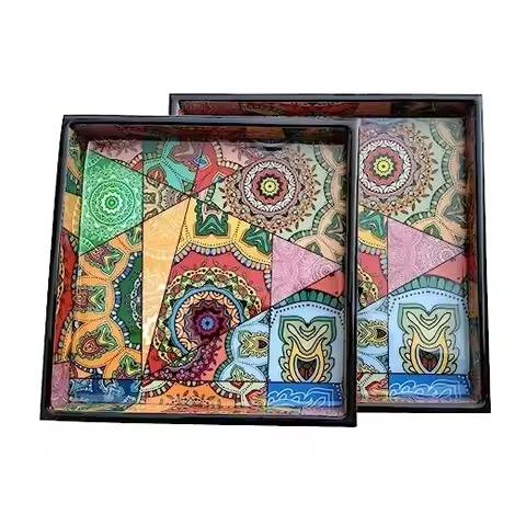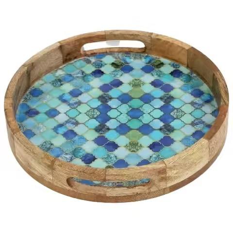 Handmade Wooden Tray Enamel Printed Serving Tray for Water Glass Coffee Table Decorative Kitchen
