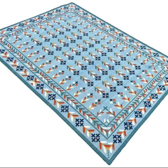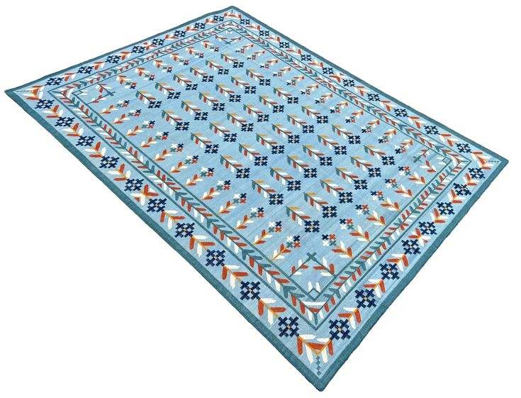 Handmade Woolen Flat View Dhurrie Area Rug Blue Cream with Red Leaf Pattern Geometric Indian Design