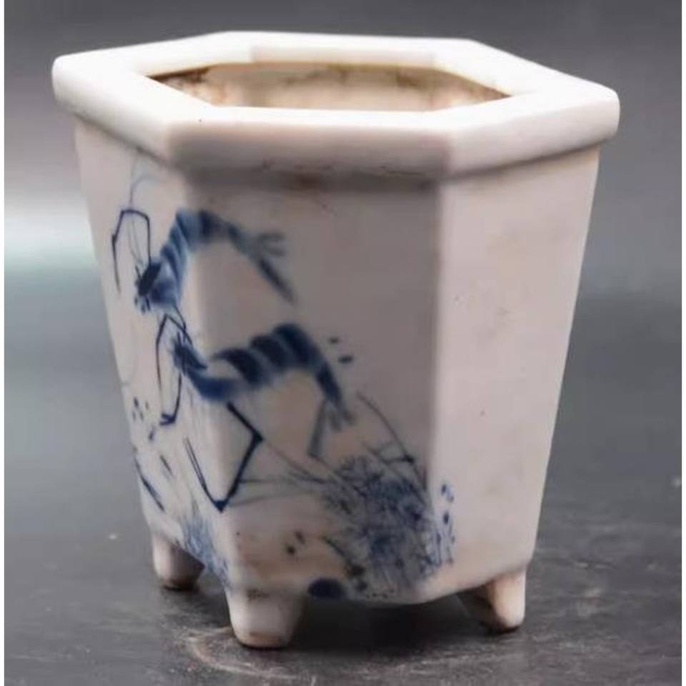 Handmade blue and white porcelain shrimp pattern flower pot, ceramic potted plant, rare shape, furniture decoration