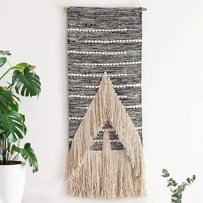 Handmade cotton macrame wall decor with symmetrical knot work and fringe details perfect for DIY home makeover projects