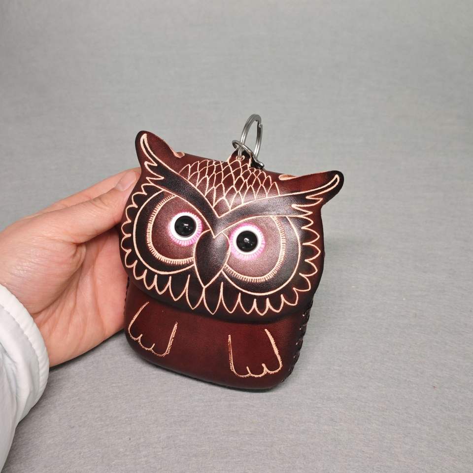 Handmade Eco-Friendly Leather Cowhide Cartoon Owl Flap Coin Purse Bag Card Key Bag Children's Animal Original