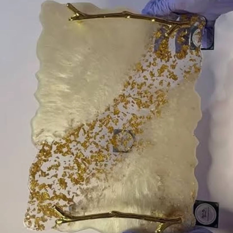 Handmade resin epoxy crafted serving trey with luxurious designs and gold foils with metal handles