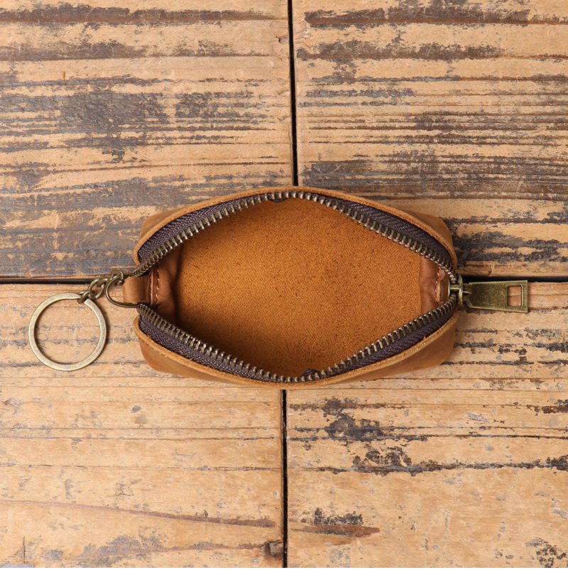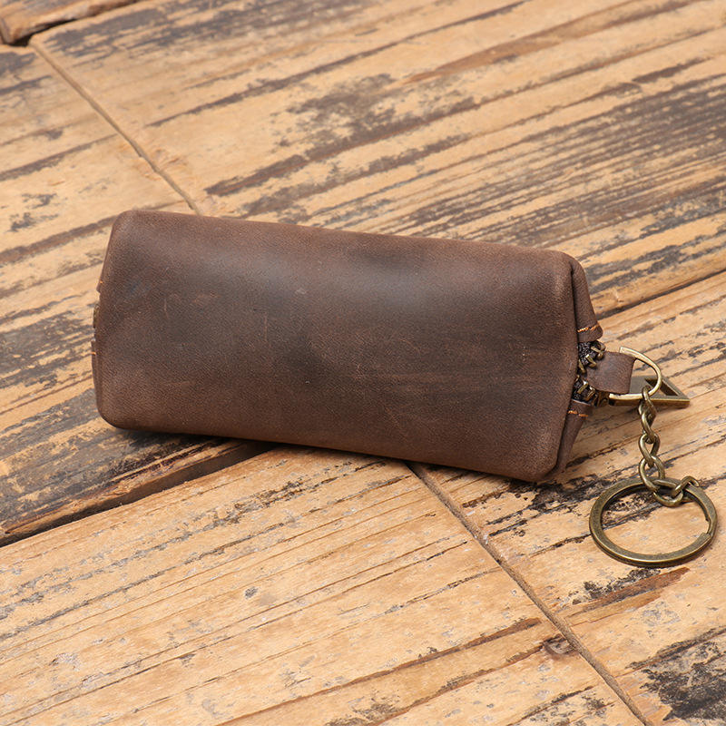 Handmade Retro Fashion Mini-sized Cowhide Key Pouch with RFID Zipper Canvas Lining Coin Pocket Large Capacity Waist Pendant