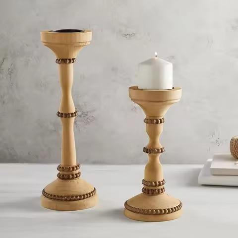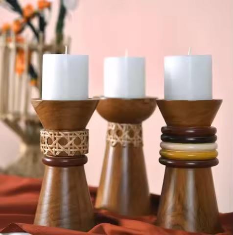 Handmade wooden pillar candle holders with intricate rattan boredr design for home table top decor
