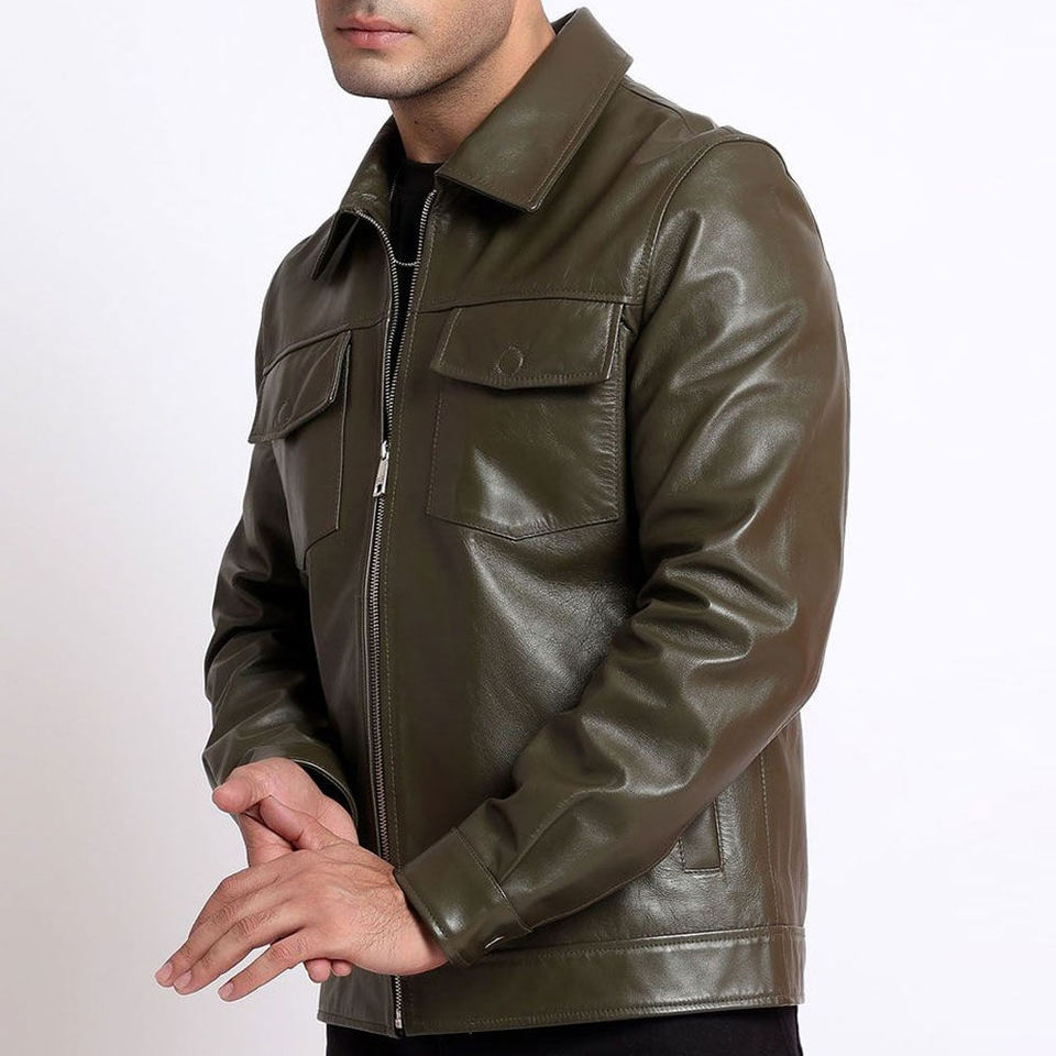 Handsome Luxury High Street Men's Biker Leather Jacket Winter Sheep Skin Front Logo Windproof Breathable Coated Zipper Jacket