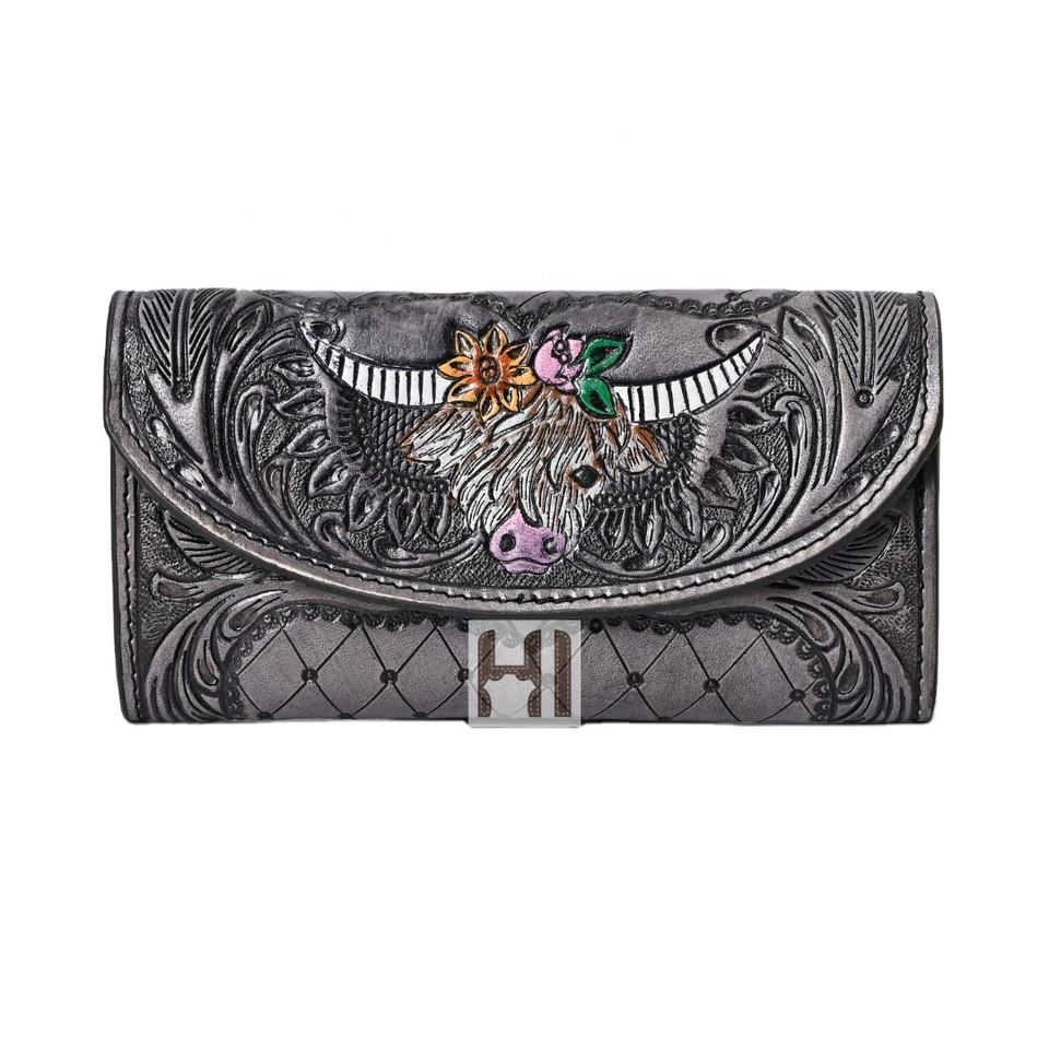 Handtooled Floral Carving Trifold Wallet Luxury Vintage Genuine Cowhide Leather Long RFID Tassel Handmade Women's Accessory