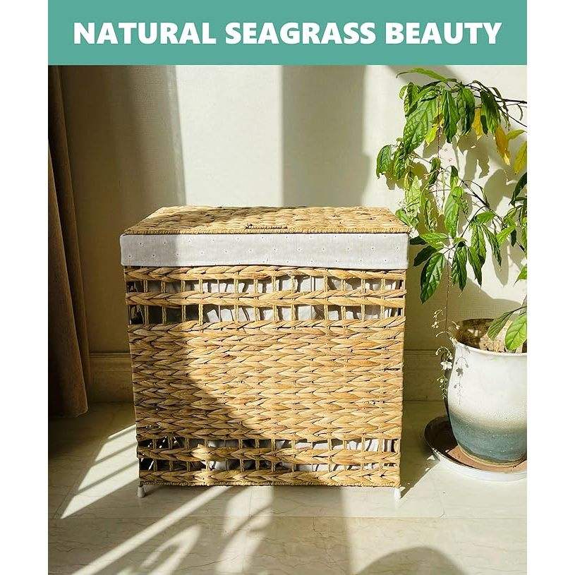 Handwoven 130L Seagrass Laundry Hamper with Lid and Linen Liners Wicker Storage Basket for Home Use