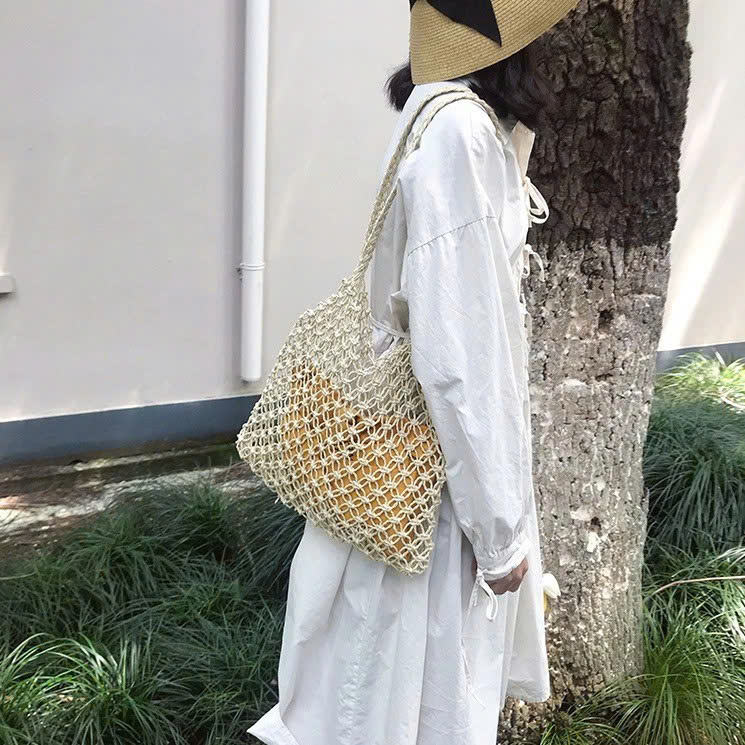 Handwoven Large Mesh Straw Bag Simple Elegant Summer Beach Tote Bag Vietnamese Handmade Woven Bag for Women Travel Holiday Use