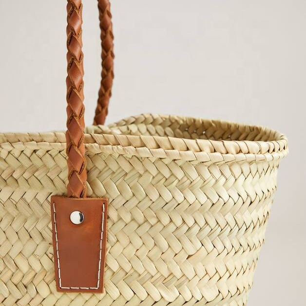 Handwoven Moroccan Straw Basket Bag Long Leather Handles Summer Beach Shopping Tote Medium Shoulder Strap Wholesale Morocco