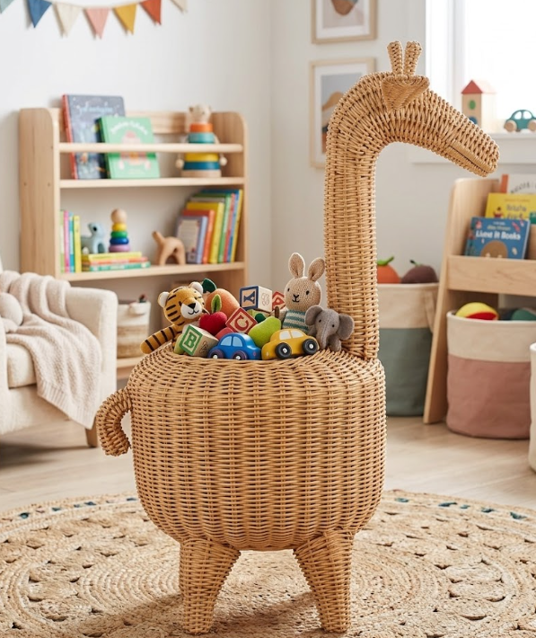 Handwoven Rattan Giraffe Storage Basket for Kids Room, Decorative Wicker Animal Toy Organizer with Lidless Open Top from Vietnam