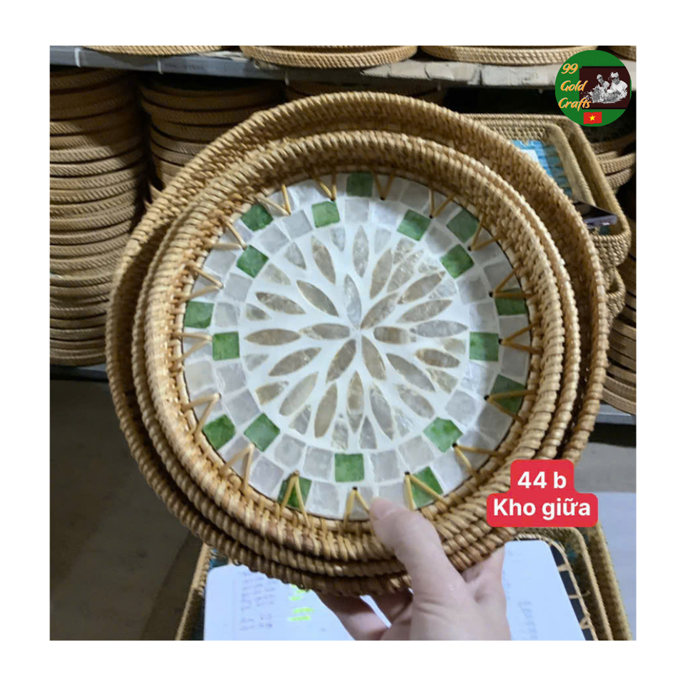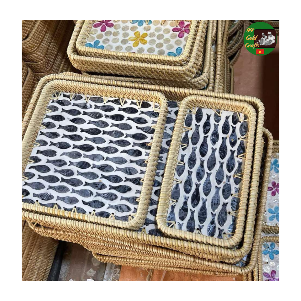 Handwoven Rattan Mosaic Serving Tray Mixed Mother of Pearl Mosaic Natural Rattan Tray for Hotel Home Decor