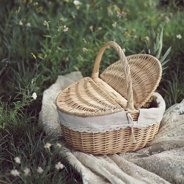 Handwoven Rattan Picnic Basket with Double Lid Natural Woven Food Storage Camping Basket with Handle Eco Friendly