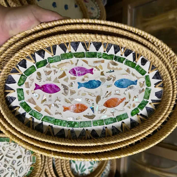 Handwoven Square Rattan Tray with Mother of Pearl Centerpiece for Decorative Table Use Vietnam
