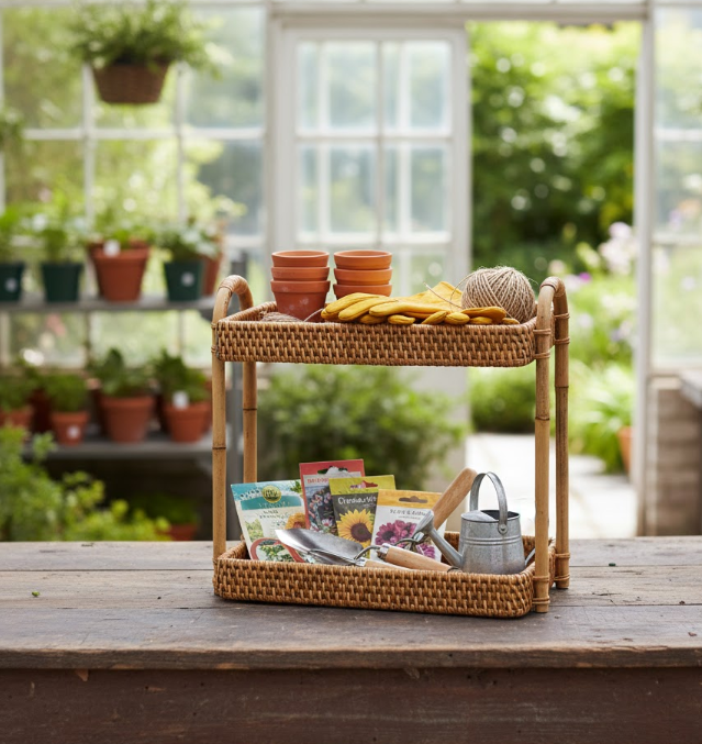 Handwoven Two Tier Rattan Storage Rack with Handle, Natural Wicker Countertop Organizer for Kitchen, Bathroom, Home Decor